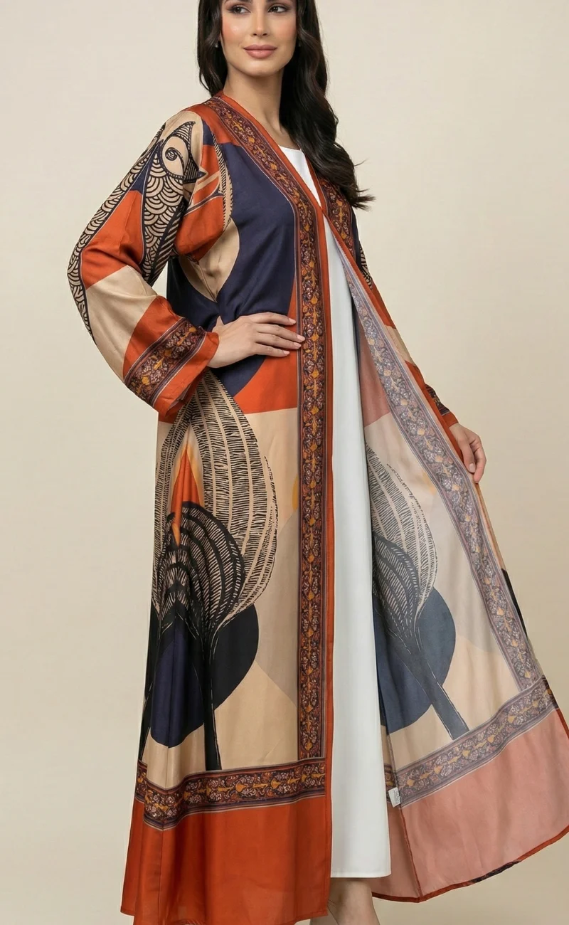 Designer note : Abstract rust and beige color-block abaya with ornate borders.