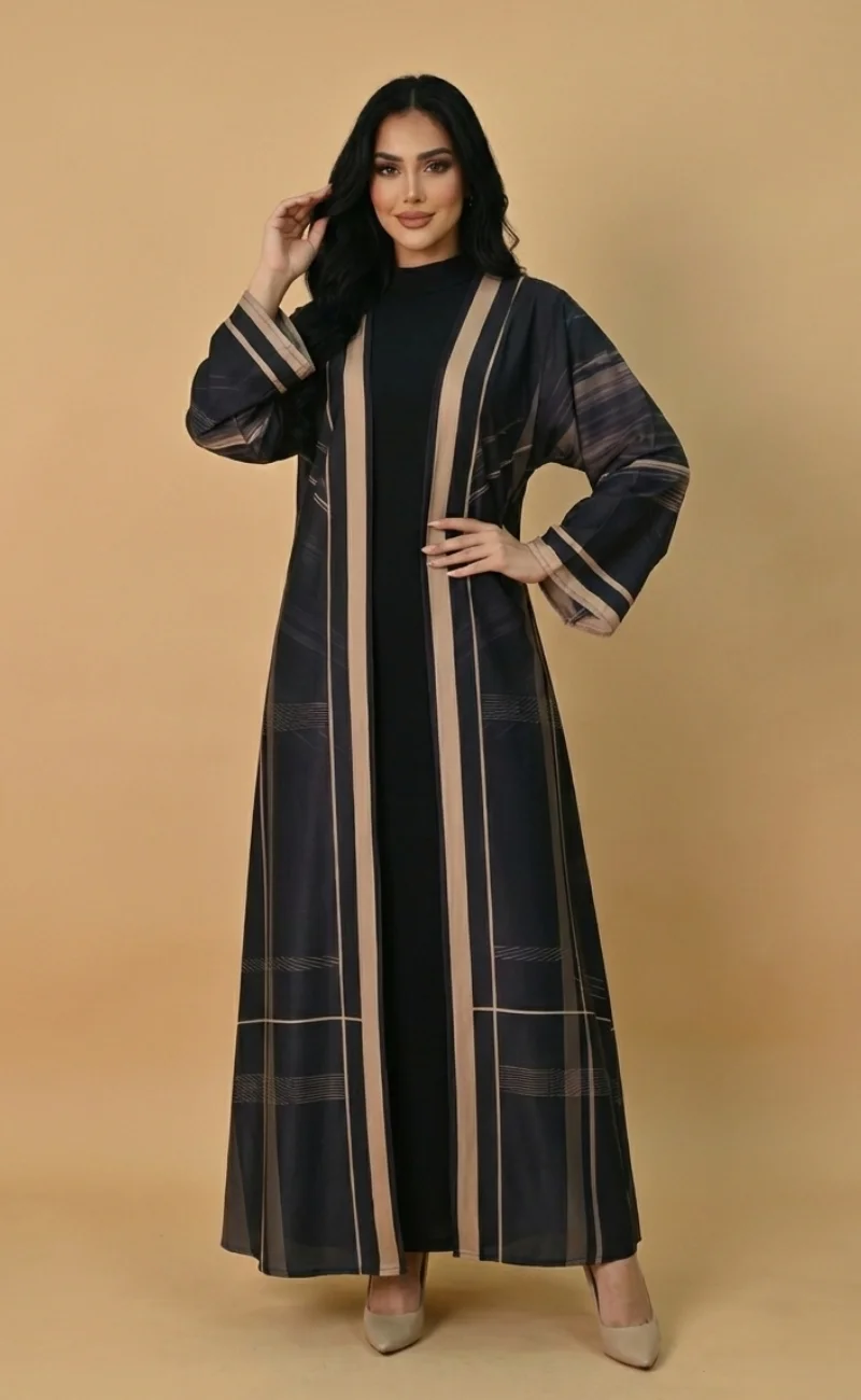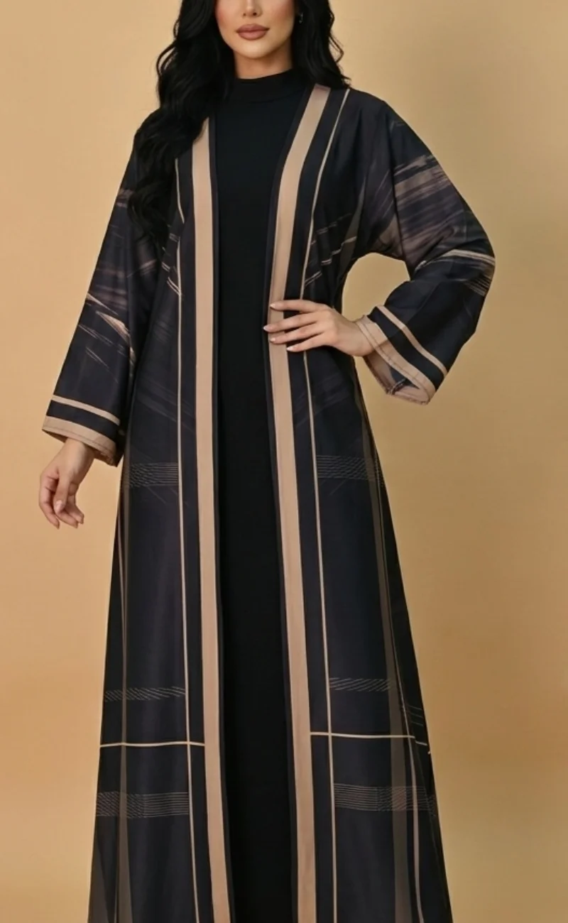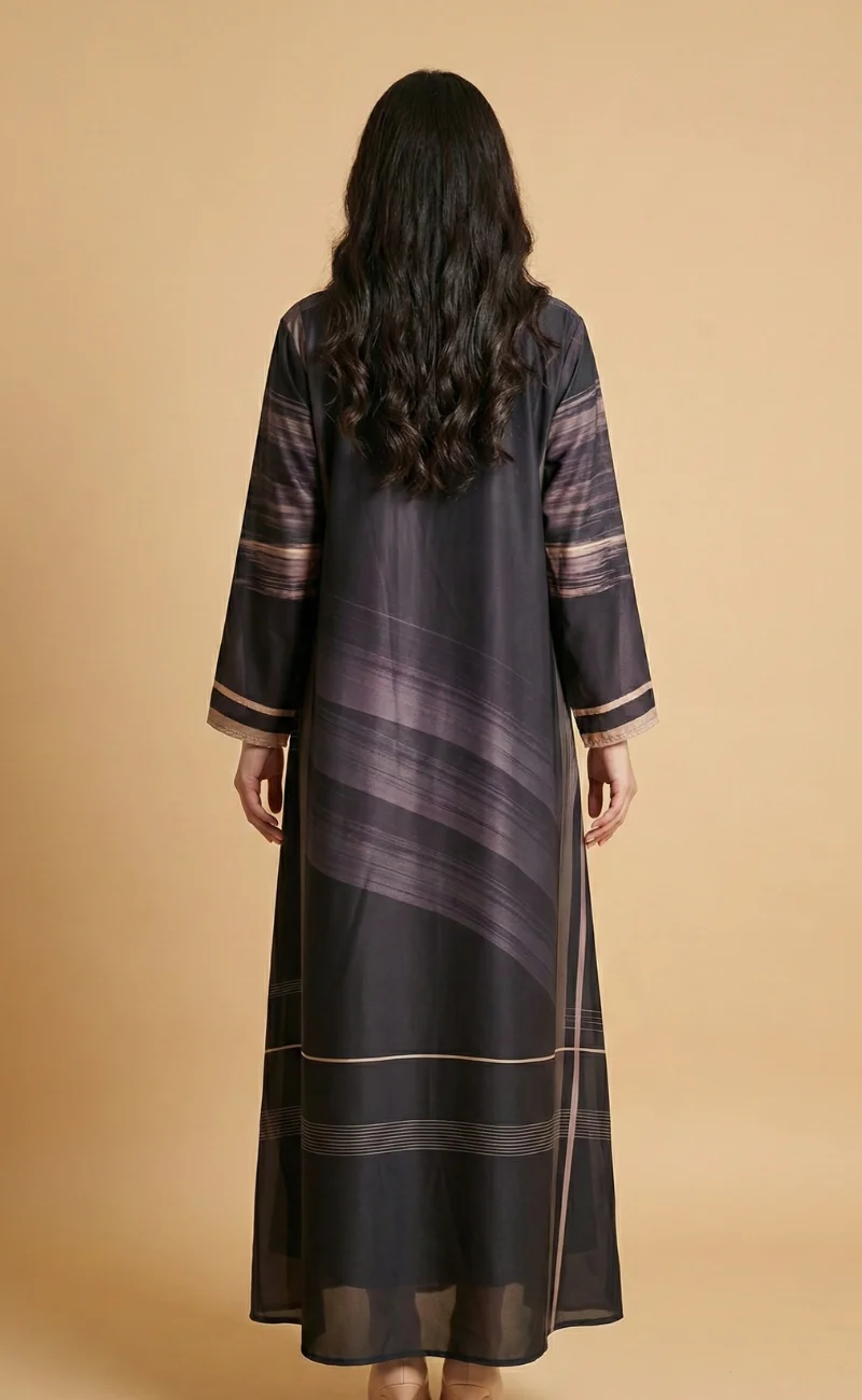 Designer note : Sleek black abaya defined by bold vertical beige stripes.